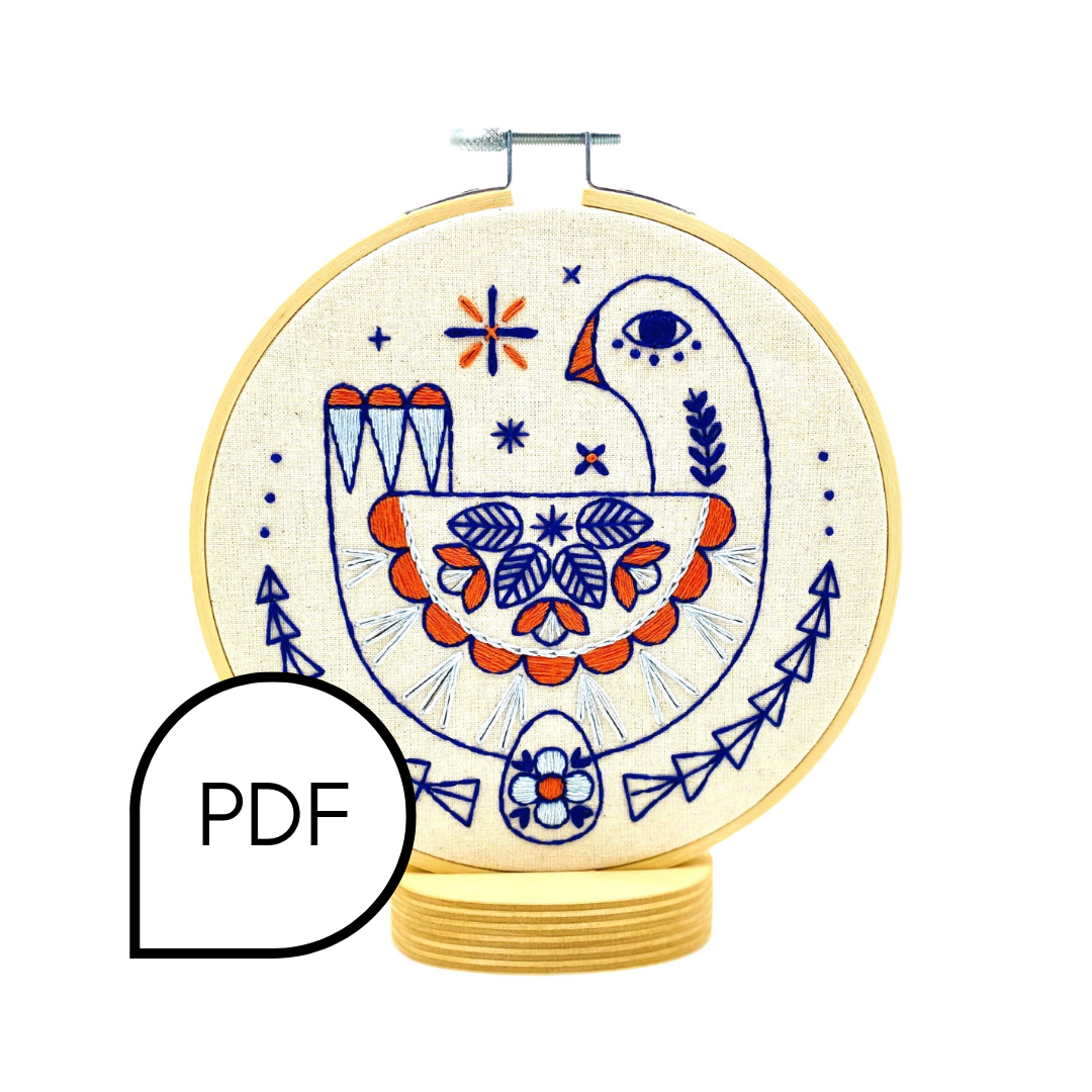 Contains basic instructions in both English and French and printable/traceable pattern sized for a 6"/15cm hoop. Colours and their quantities are specified. Please note that downloads are non-refundable.