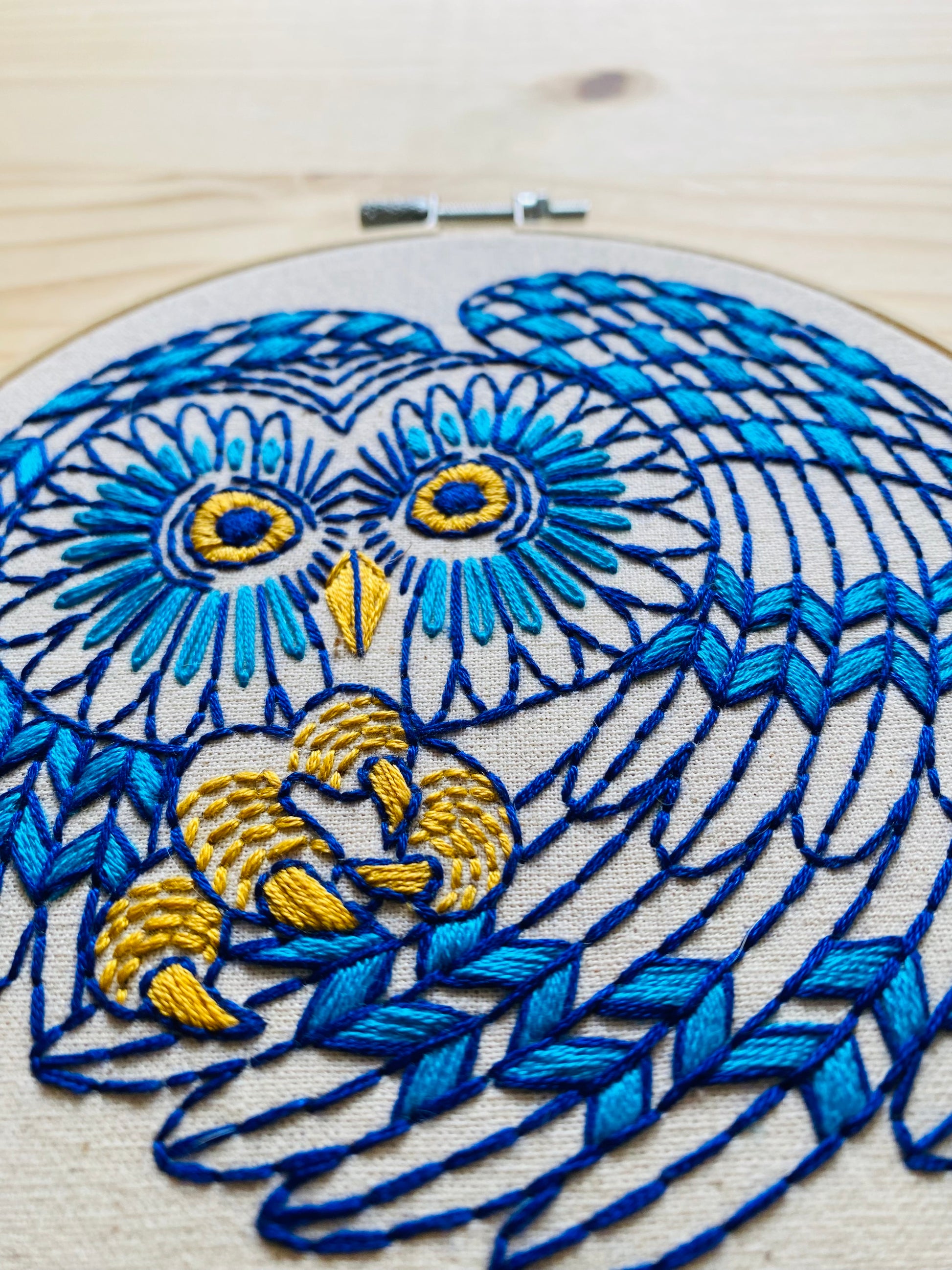 Our Boreal Owl has a unique tonal palette of 3 bold colours and features a sampler combination of satin, link, back stitch and French knots. Designed in our signature modern, Scandi inspired folk style. Click here to view the Northern Owls Collection