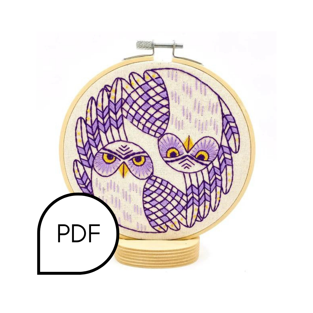 One of 4 unexpectedly colourful owl patterns. Our Burrowing Owls have a unique tonal purple plumage, pulse and bold colours. This pattern features a combination of satin, link, back stitches and french knots. Click here to view the Northern Owls Collection
