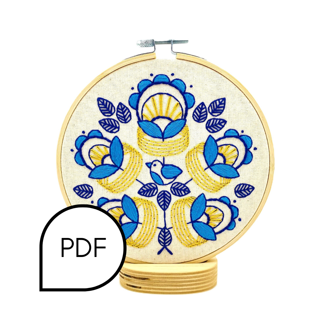 Contains basic instructions in both English and French and printable/traceable pattern sized for a 6"/15cm hoop. Colours and their quantities are specified. Please note that downloads are non-refundable.