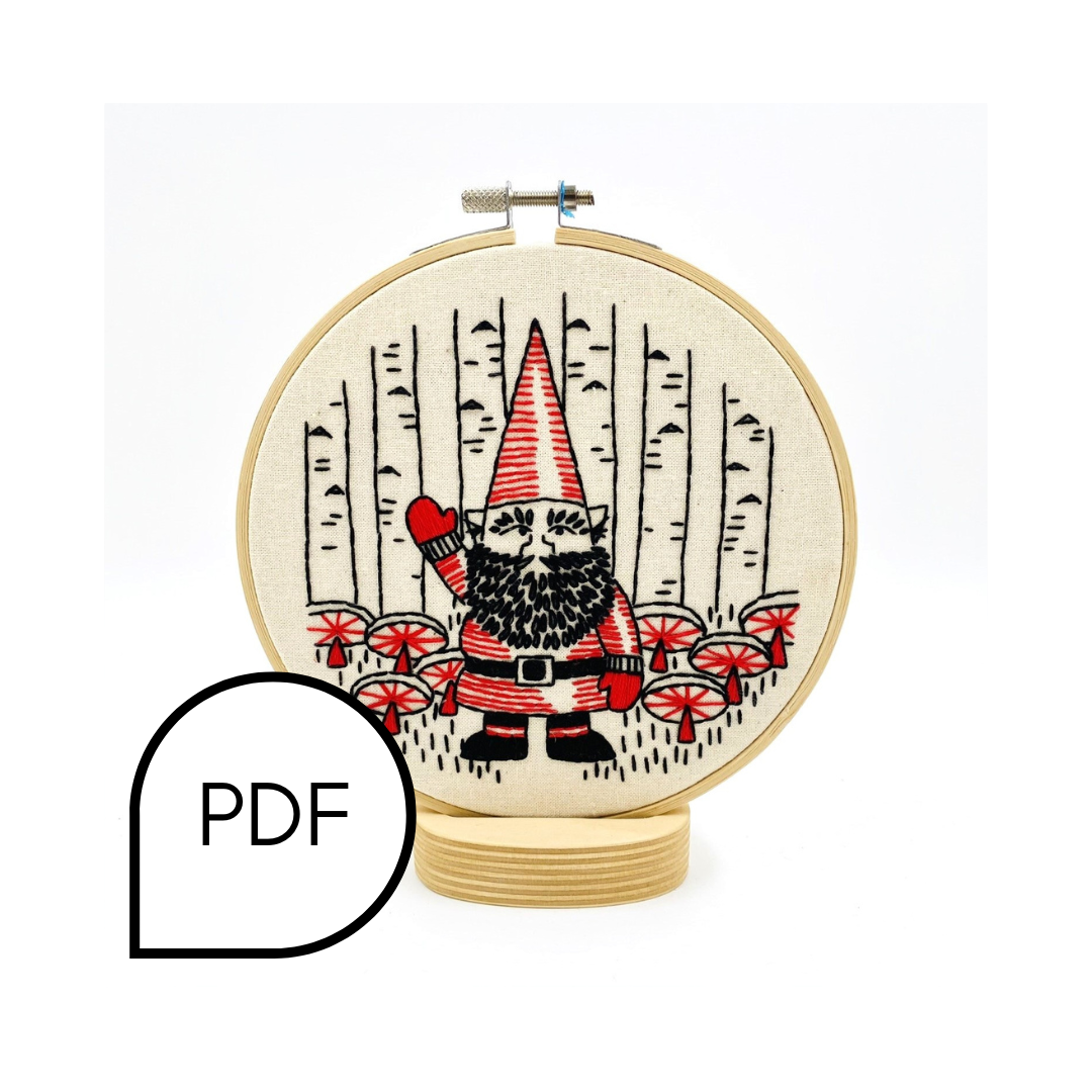 Don't be fooled by the name "Gnomework", this friendly, forest dwelling fellow is all play. Surrounded by modern, abstract mushrooms, he's right at home in a poplar forest. The gnome and woodland scene is made using a series of beginner embroidery stitches, including a backstitch (he's mostly backstitch...easy peasy), detached chain (link) for his beard, satin stitch, and two French knots for eyes. BTW The satin stitch is edged with a backstitch because it looks great AND hides any imperfections so you always look like a pro. It's like magic!