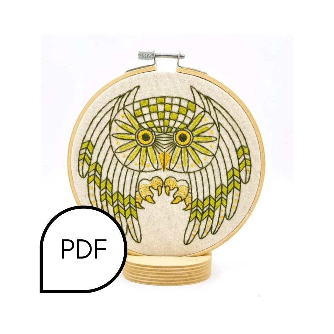 One of 4 unexpectedly colourful owl patterns. The Great Horned Owl has a piercing gaze and uses 3 bold colours. This pattern features a combination of satin, link, back stitches and french knots. Click here to view the Northern Owls Collection
