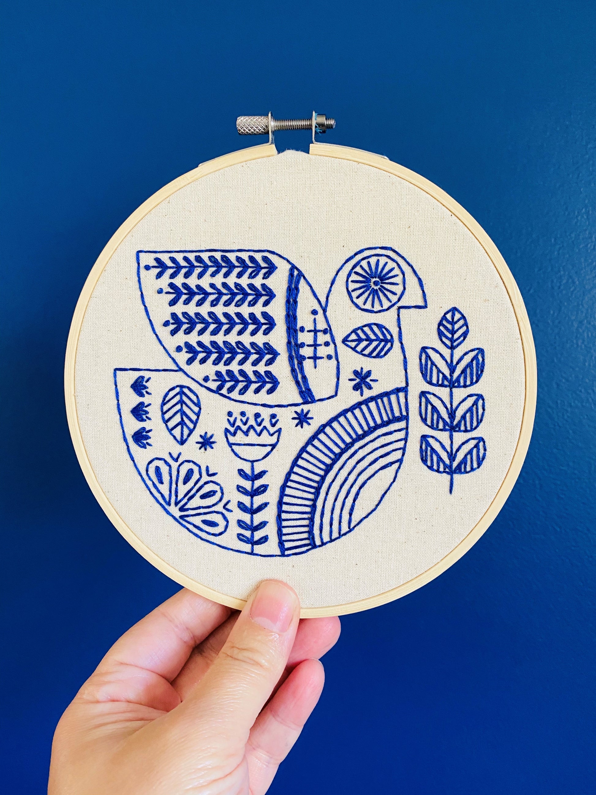 Inspired by the simplicity of Scandinavian design, this dove pattern is perfect year-round. Stitches in dramatic navy blue focus place the focus on texture rather than colour, but you can add or change up the palette with your own floss to create your own unique interpretation. And you control the difficulty - keep it easy by using the most basic back stitch throughout, or ramp up the challenge with chain stitches, French knots, or more. Either way, cosy up with a cup of tea on a cool night and relax with this one of 3 hygge patterns.