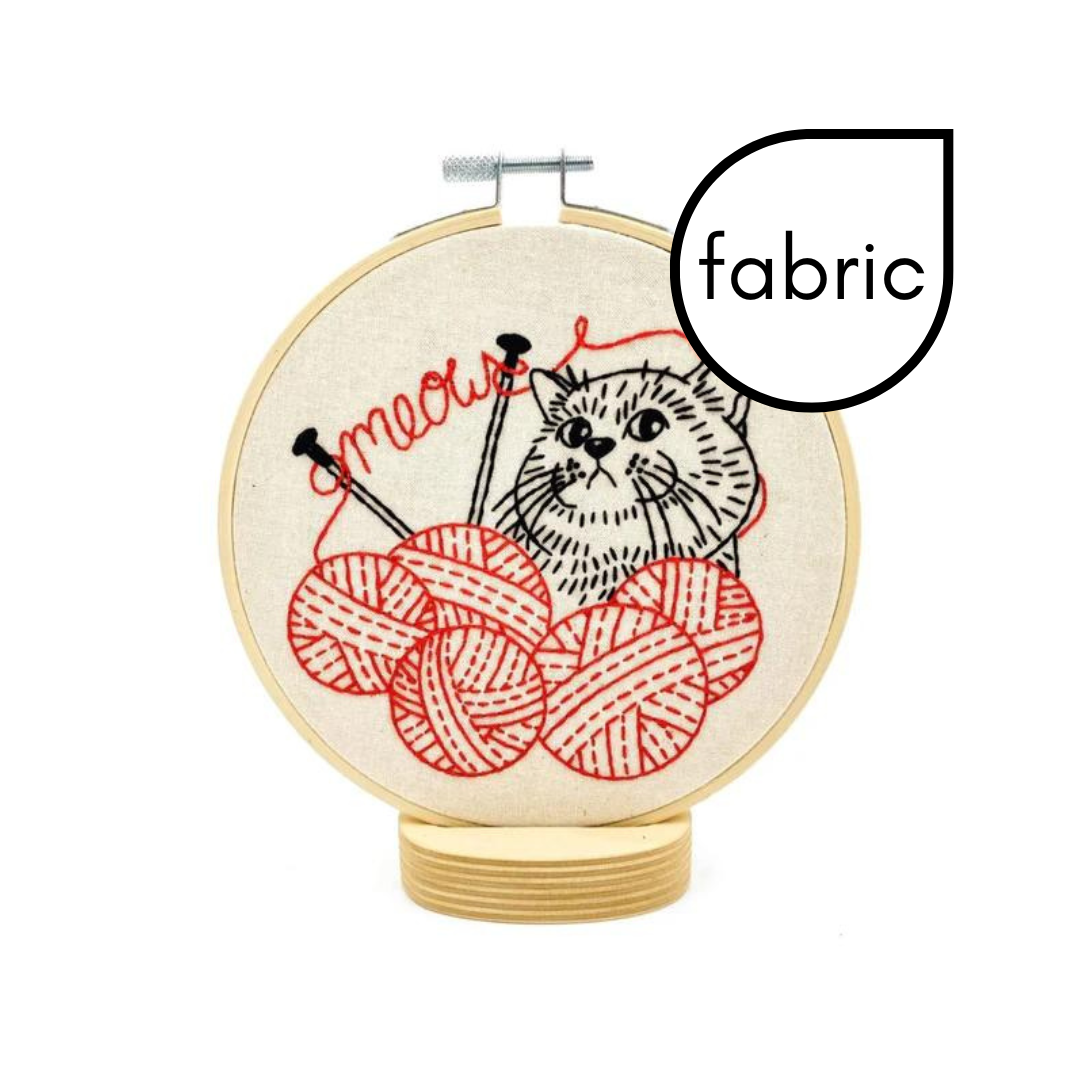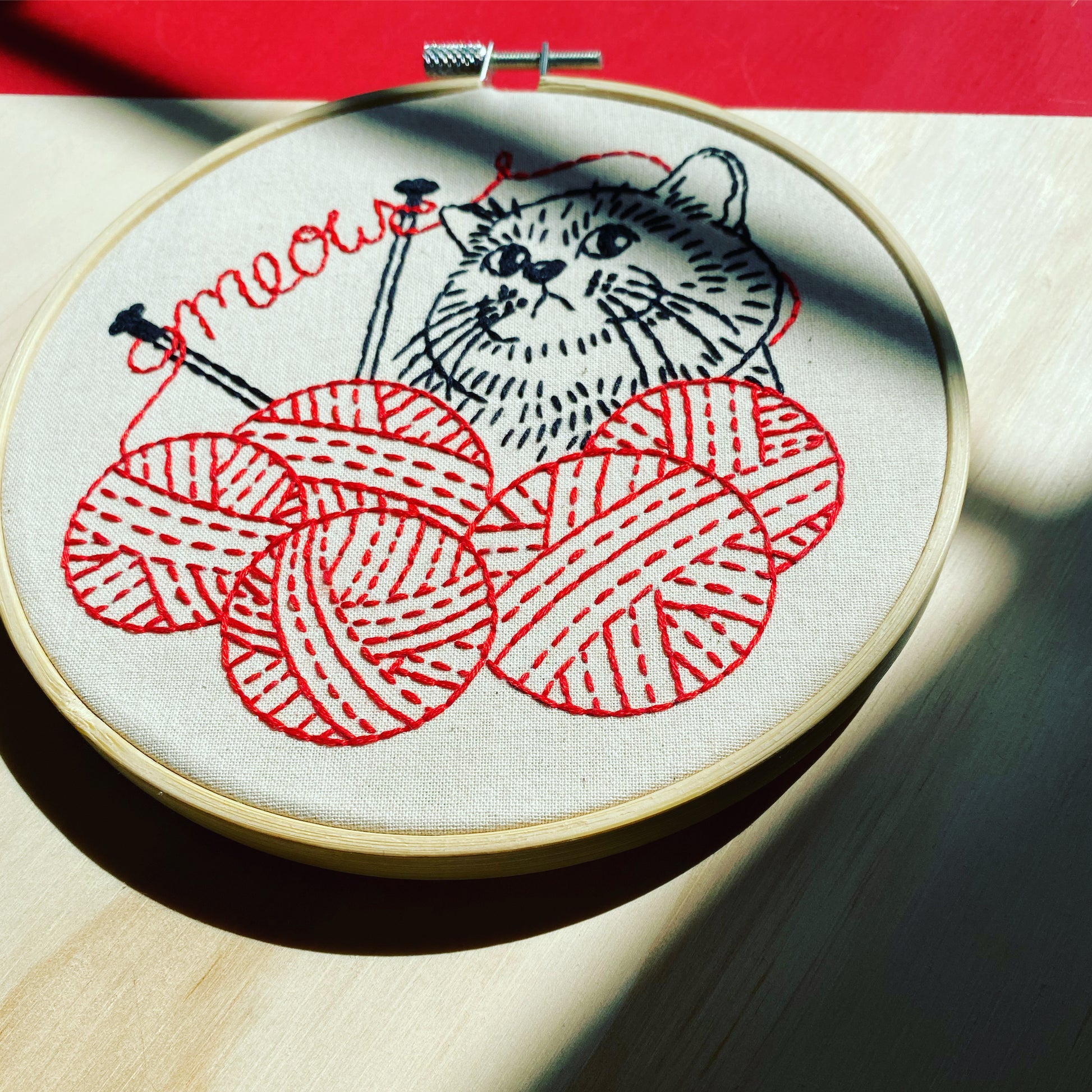 Meow! This kitten is ready to play. This design is perfect for cat people and knitters alike. Featuring basic embroidery techniques like the back stitch and satin stitch, this kit is perfect for beginners.
