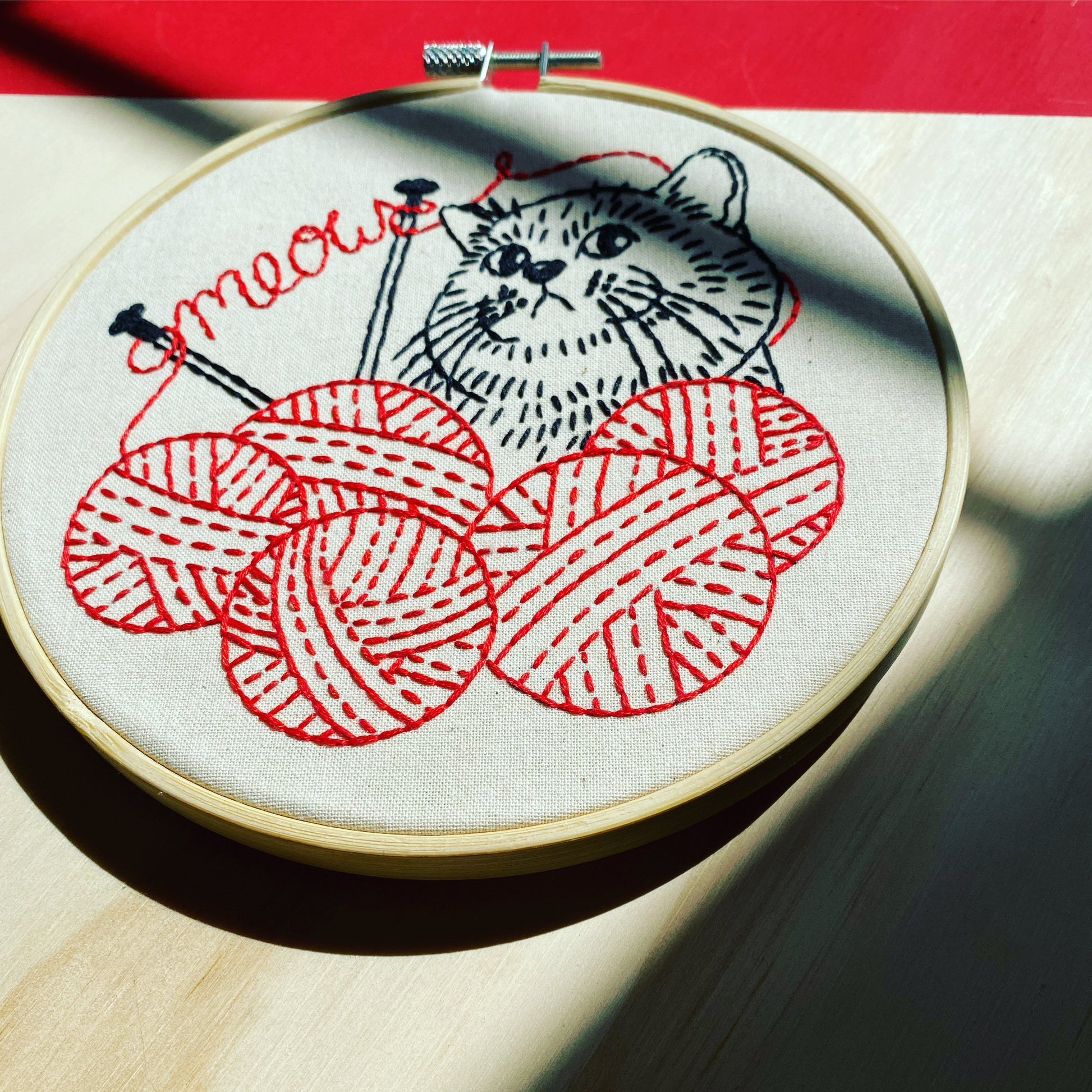 Meow! This kitten is ready to play - with yarn. It's a knittin' kitten. This design is perfect for cat folk and knitters alike.