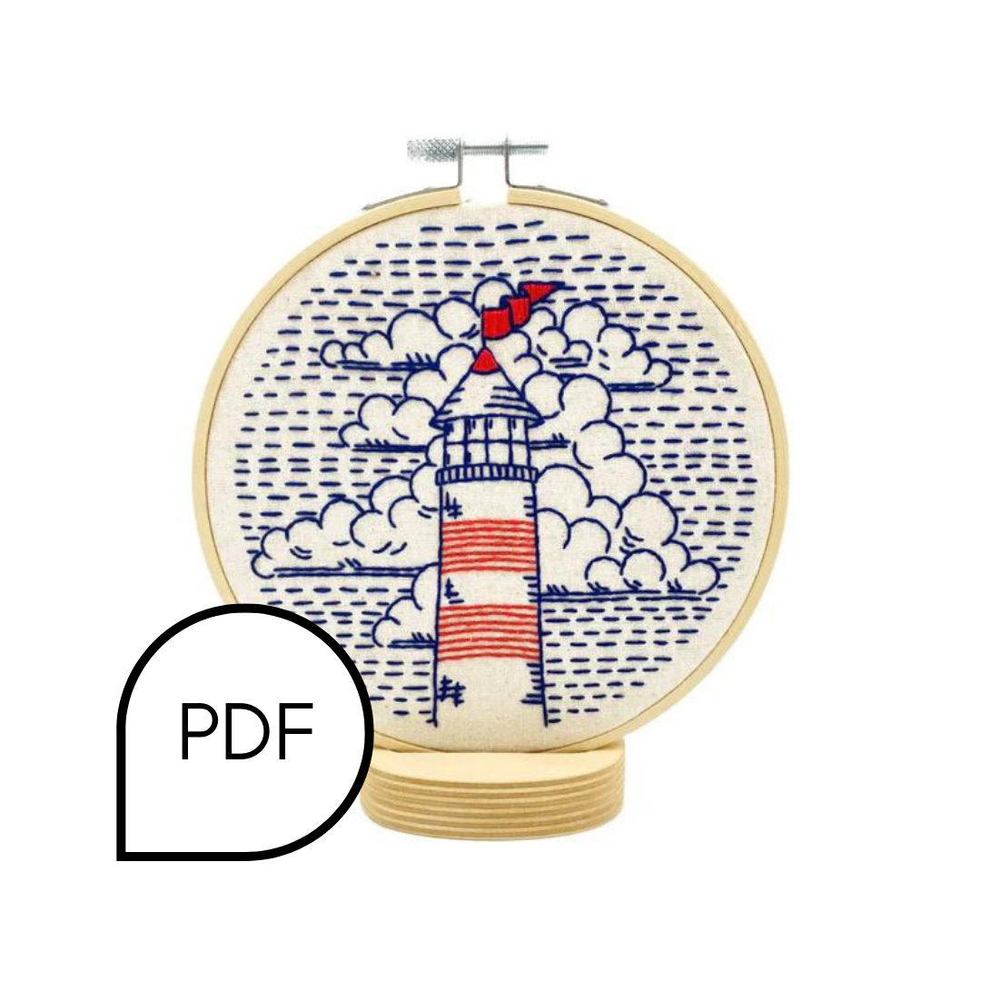 There is something mesmerizing about a lighthouse highlighted against the sea and sky. The rocky coastline of Nova Scotia is dotted with these traditional beacons of both light and warning —at once they say “welcome home” and “watch for rocks”. Either way, they are classic seaside protectors. Except for the tiny little flag, this pattern is made entirely of the easiest single stitch and backstitch. And you know, that blue backstitch around the outside of the satin stitch looks great and hides any imperfections, so you look like a pro no matter what!
