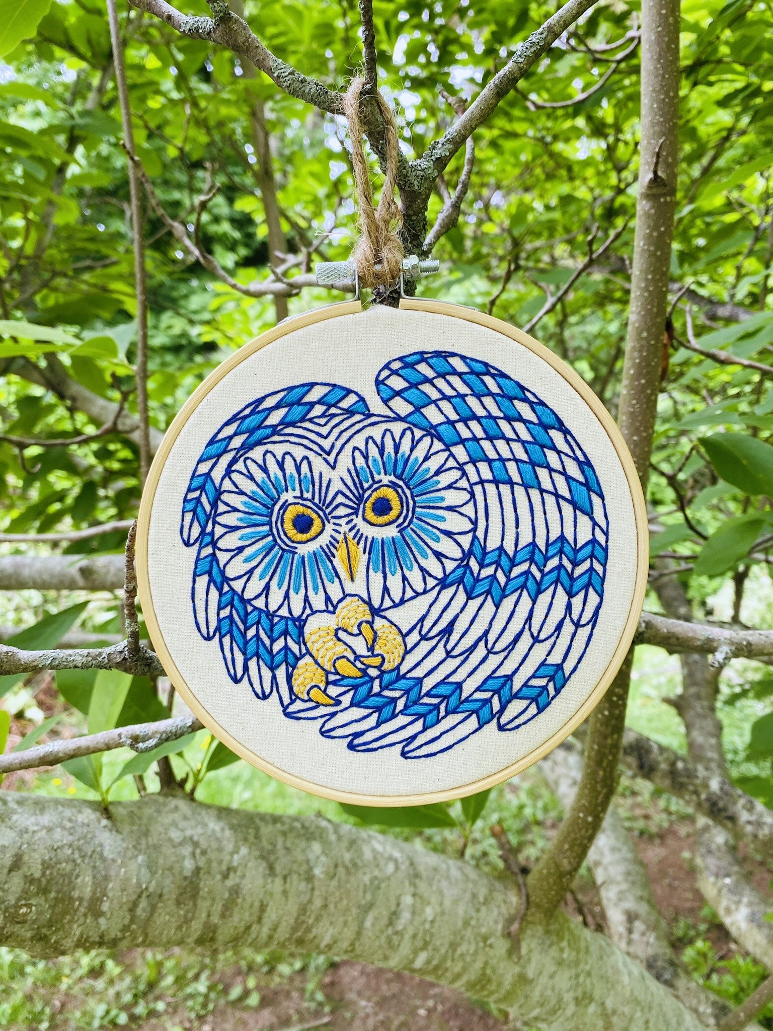 The Boreal Owl comes in tonal blues with bright pops of yellow. This pattern features a combination of satin, link, back stitches and french knots. Click here to view the Northern Owls Collection