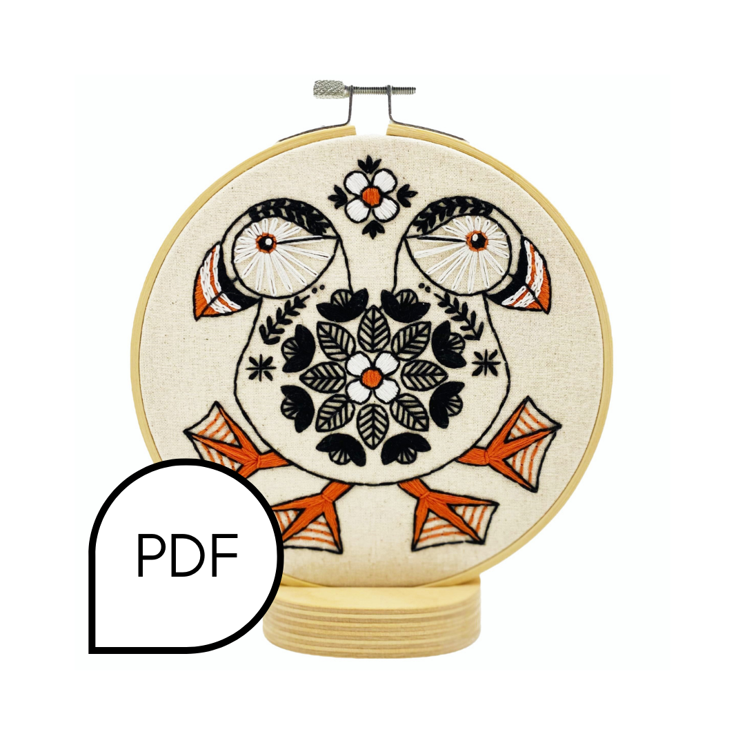 Feeling pretty chuffed about this Puffin! A bold, tonal palette of 3 bold colours features a sampler combination of satin, link, back stitch, chain, and French knots. Designed in our signature modern, Scandi / Nordic inspired folk style.