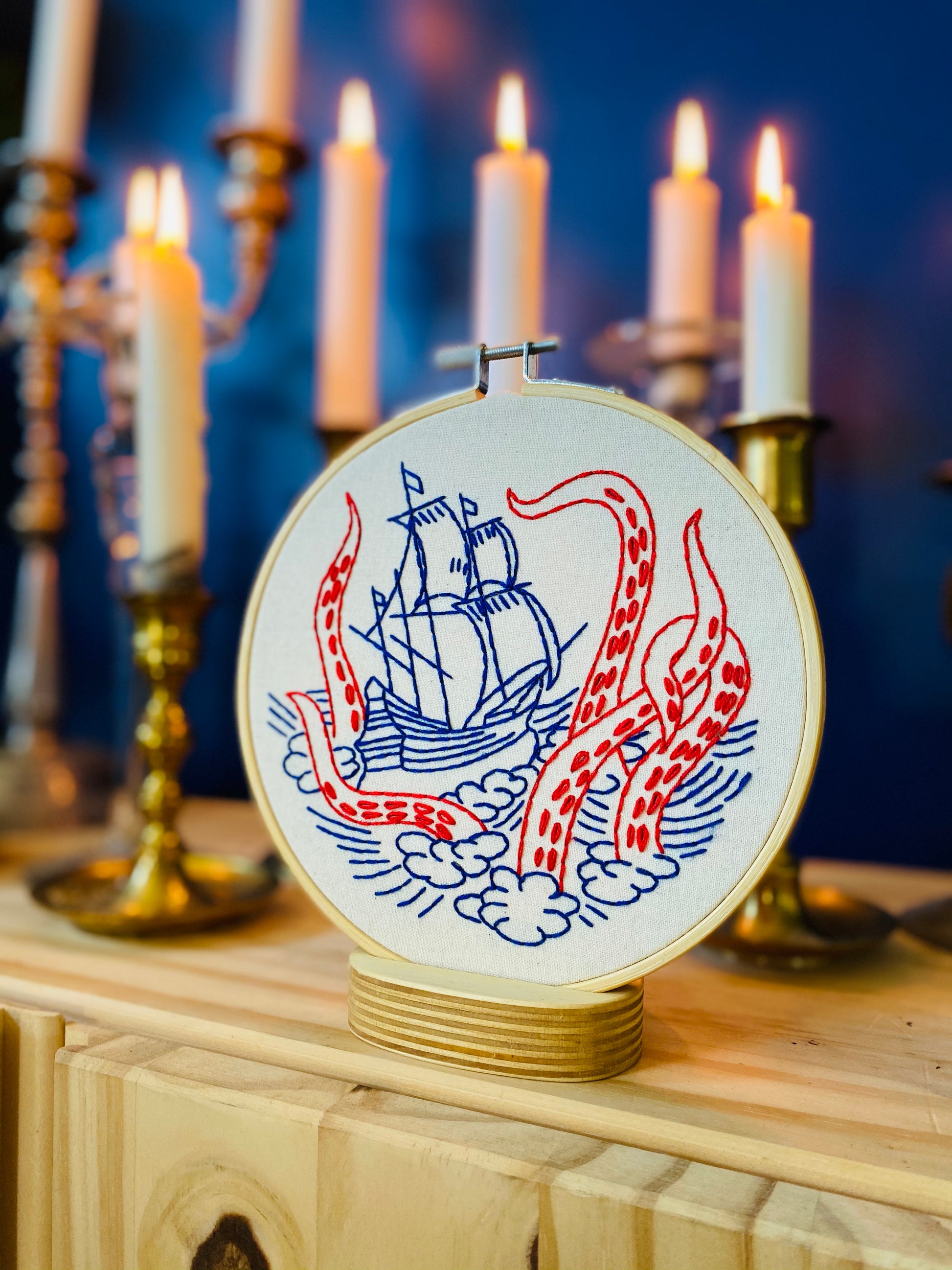 A legendary sea monster feared by those who dared to sail the seas, the Kraken makes for tentacular stitching. Part of our nautical collection.