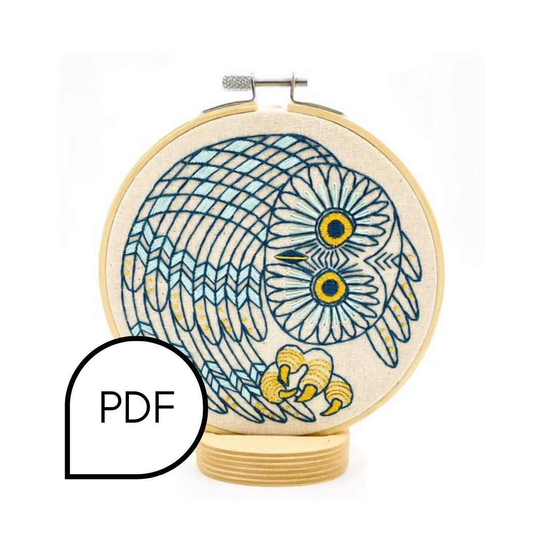 The Saw Whet Owl comes in tonal teal with bright pops of yellow. This pattern features a combination of satin, link, back stitches and french knots. Click here to view the Northern Owls Collection