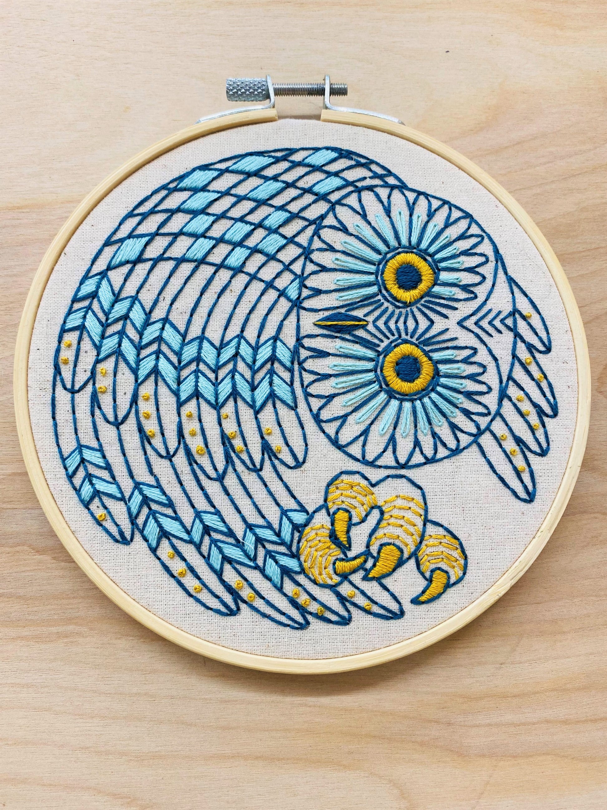 The Saw Whet Owl comes in tonal blues with bright pops of yellow. This pattern features a combination of satin, link, back stitches and french knots. Click here to view the Northern Owls Collection