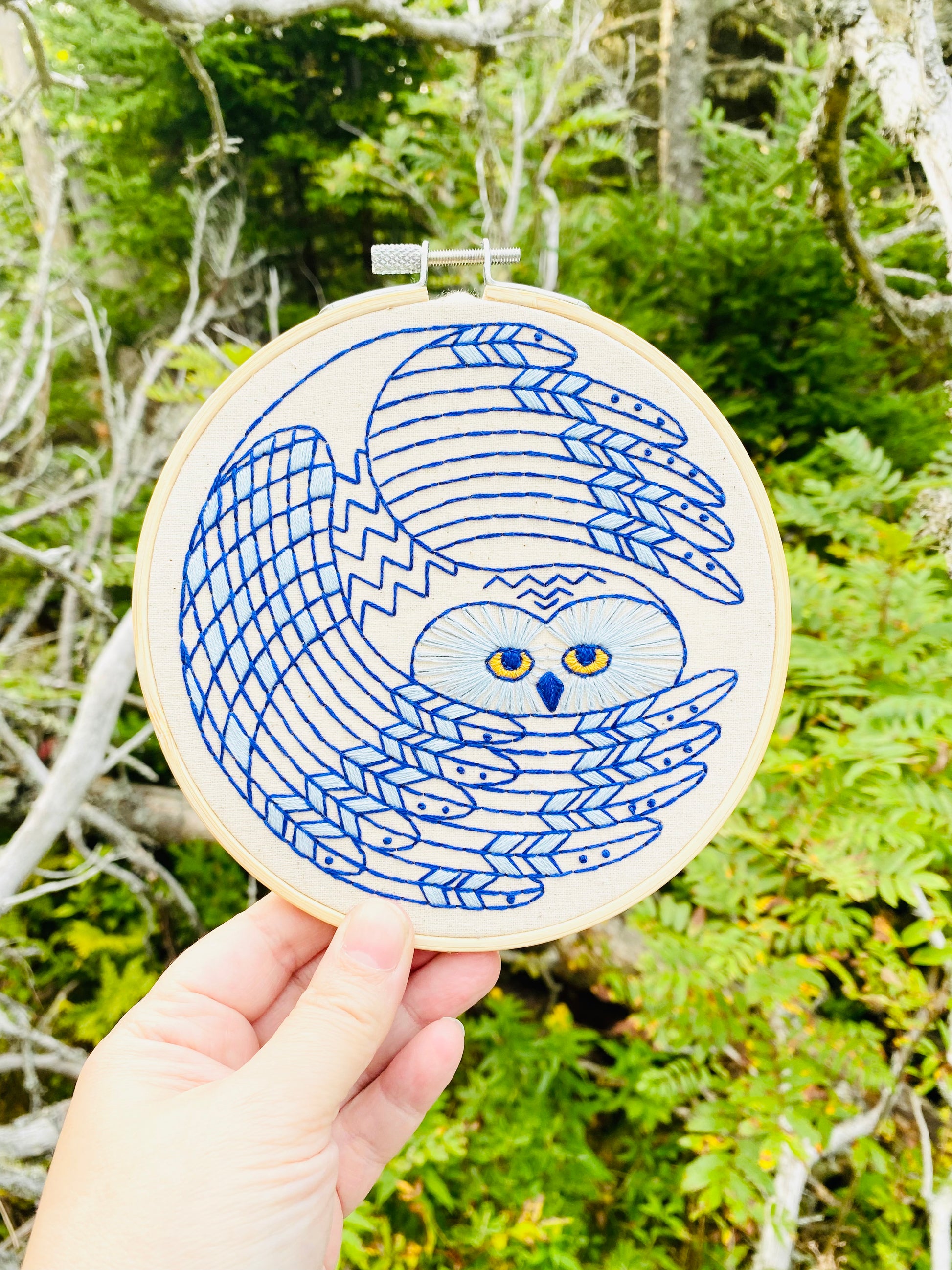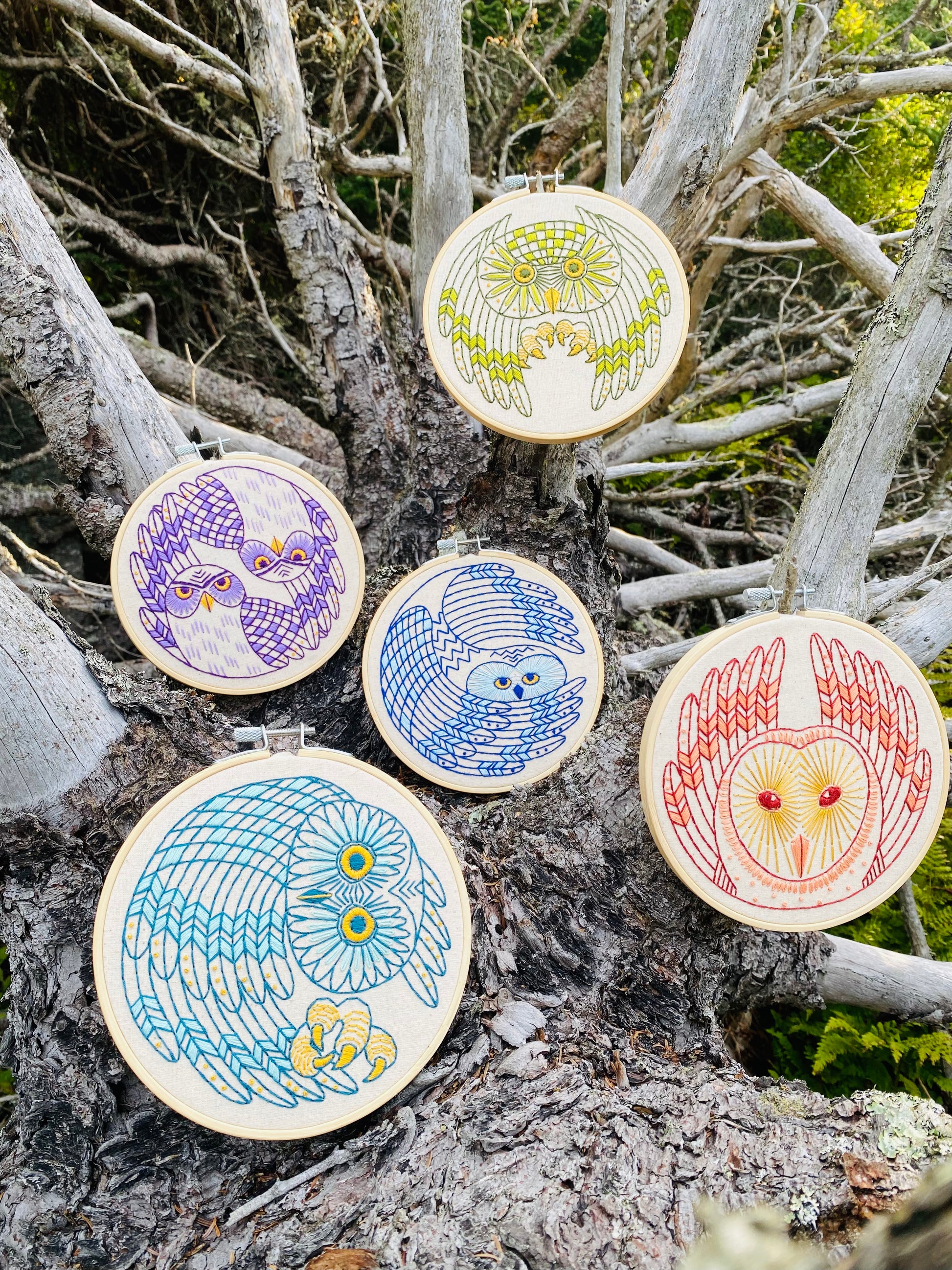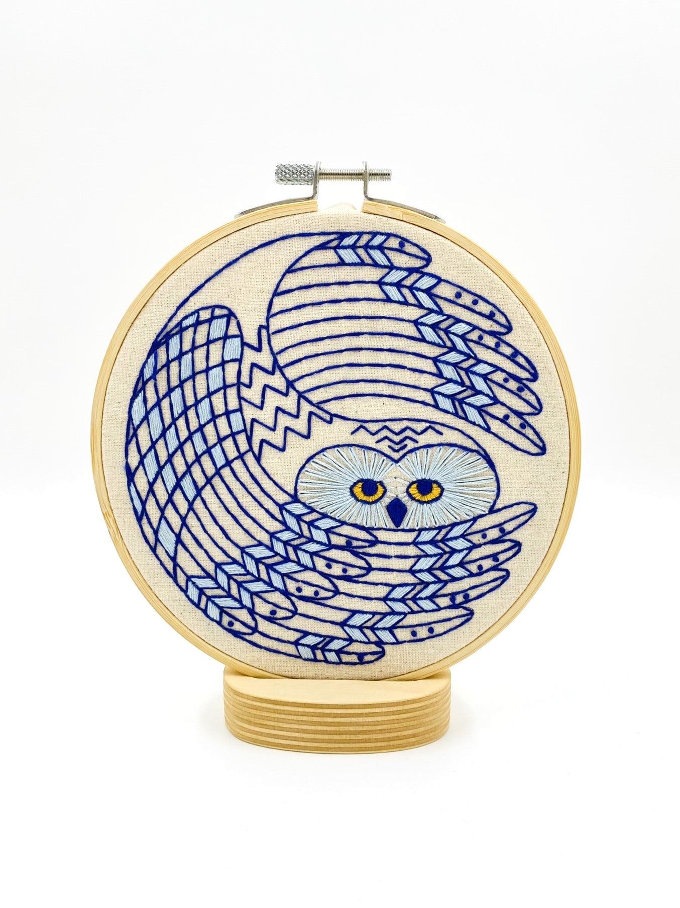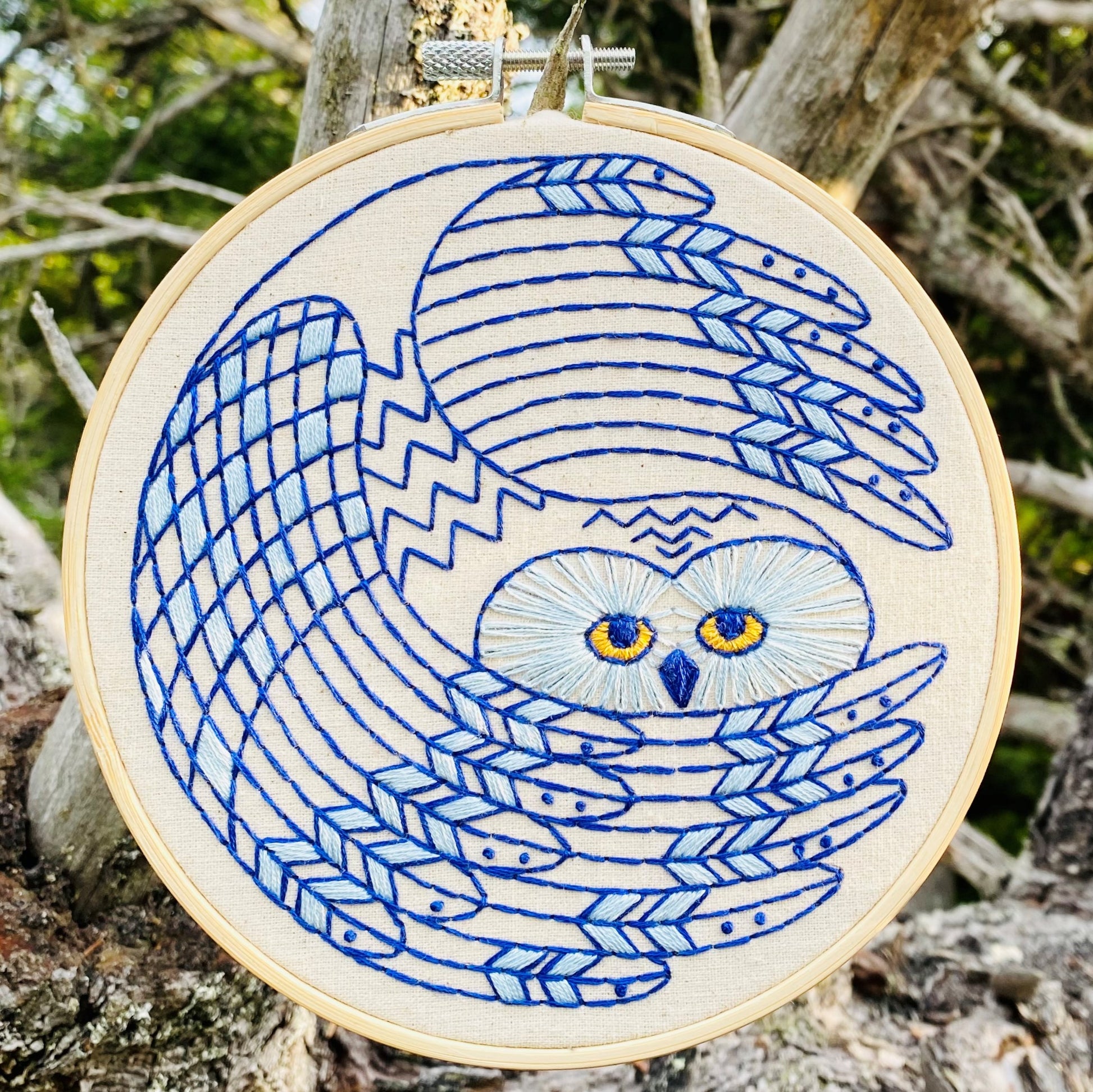 Our Snowy Owl has a unique tonal palette of 3 bold colours and features a sampler combination of satin, link, back stitch and French knots. Designed in our signature modern, Scandi inspired folk style. Back in stock! Click here to view the Northern Owls Collection