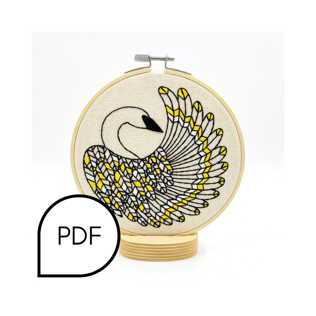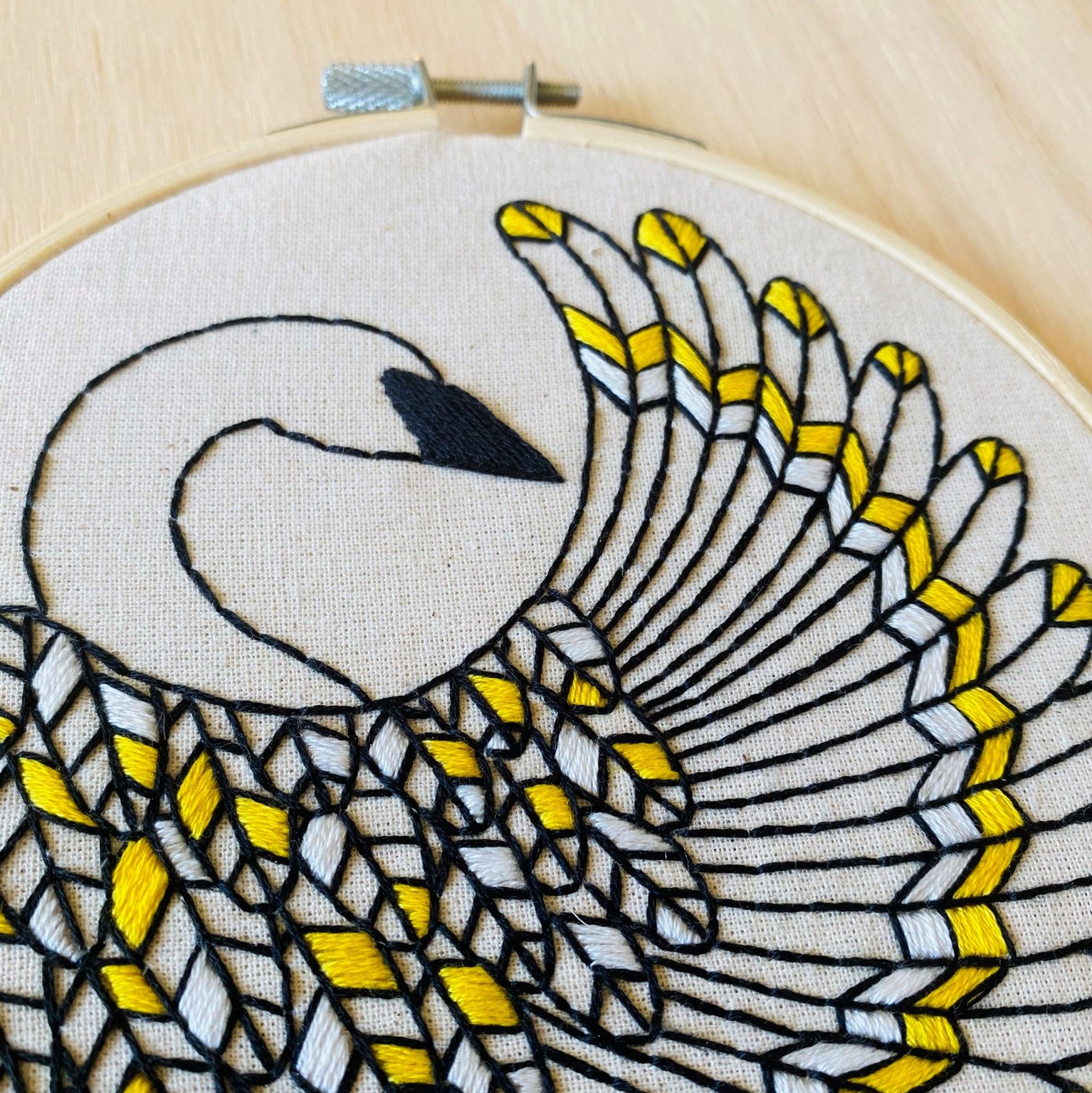 Sized for a 6"/15cm hoop. Requires 1 skein each floss: 310 black, 444 yellow, white/blanc.